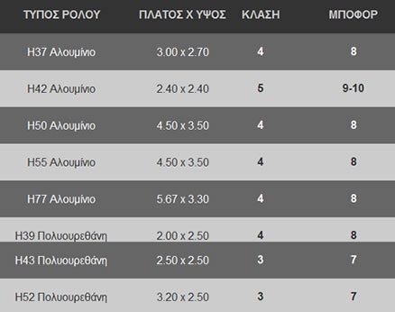 - Μηχανισμό ανύψωσης με μοτέρ απλό, μοτέρ μανιβελάτο, μοτέρ ανίχνευσης εμποδίου, μοτέρ με τηλεχειρισμό (απλό ή ομαδικό)